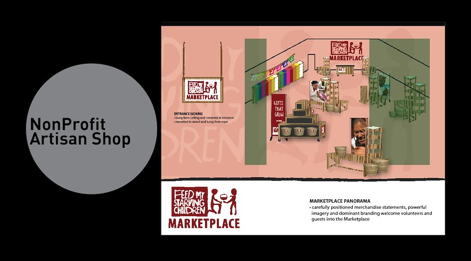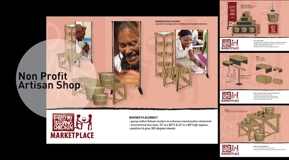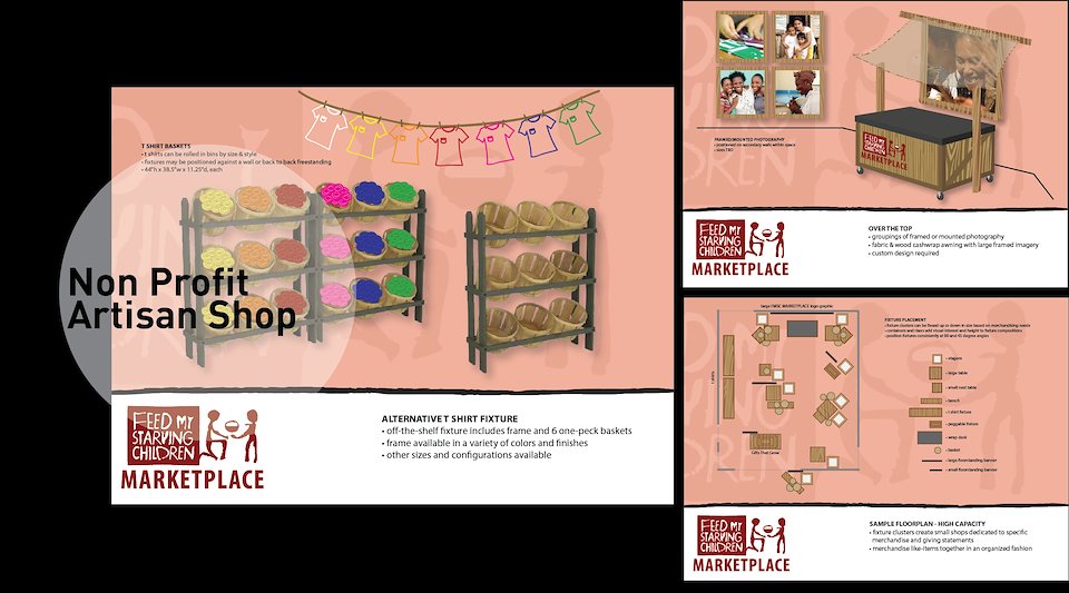 Fixture and visual merchandising package for the Feed My Starving Children’s Marketplace Artisan Shops.
