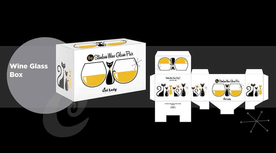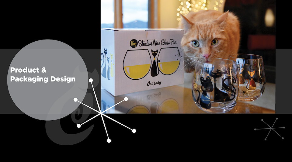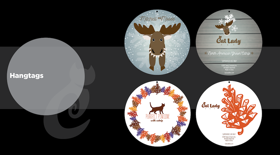 Packaging, product and signage design for CatLadyBox, the first monthly box of unique and cat-themed items for cat ladies and their cats. Each month’s box has a theme, like MidCentury Modern, Winter Wonderland, Cat Mom’s Day, etc.